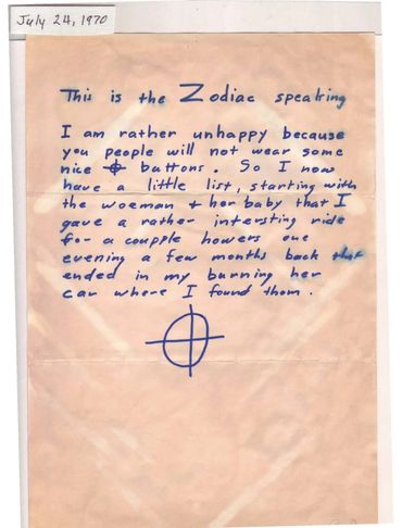 The Zodiac is the pseudonym of an unidentified serial killer who murdered at least five people in the San Francisco Bay Area between December 1968 and October 1969. The Zodiac attacked three couples and a cab driver in Benicia, Vallejo, unincorporated Napa County, and the city of San Francisco. Two of the Zodiac's seven victims survived.